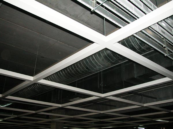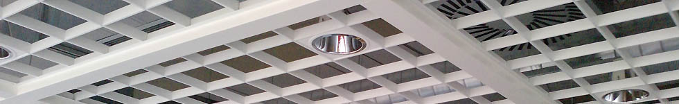 abgehängte Decken in verschiedenen Ausführungen sind eines der wichtigsten Elemente im Ladenbau. Gipsrasterdecken oder offene Rasterdecken in Metallausführung ermöglichen die Integration von Beleuchtung und Klima.